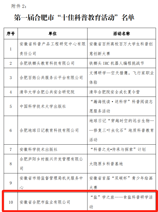 合肥鹽業(yè)先后獲評(píng)合肥市科普教育基地、安徽省科普示范單位、安徽省科學(xué)技術(shù)普及基地。
